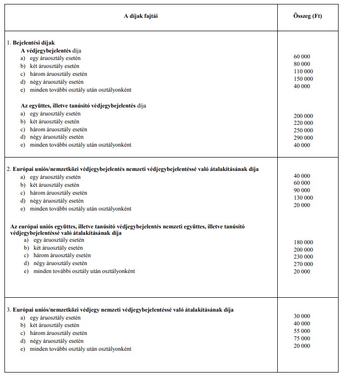 A nemzeti – azaz magyarországi hatállyal rendelkező – védjegy bejelentési díja egy áruosztály vonatkozásában papíralapú benyújtás esetén 60.000 Ft, míg elektronikus benyújtás esetén 51.000 Ft. A bejelentési díjat nem kell azonnal megfizetnünk, az SZTNH a bejelentés napjától számított 30 napos határidőt biztosít erre. Előbbi díj(ak) egy áruosztály esetén érvényes(ek), minden további áruosztály növeli kiadásainkat, alábbi táblázat szerint (forrás: www.sztnh.gov.hu)
